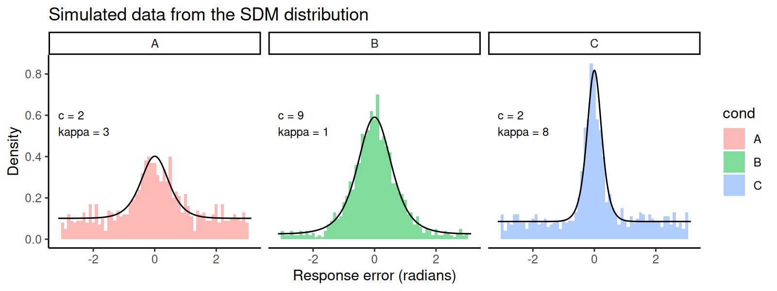 ff <- bmf(c ~ 0 + cond, kappa ~ 0 + cond)Then we specify the model, which in this case is just sdmSimple(), and we