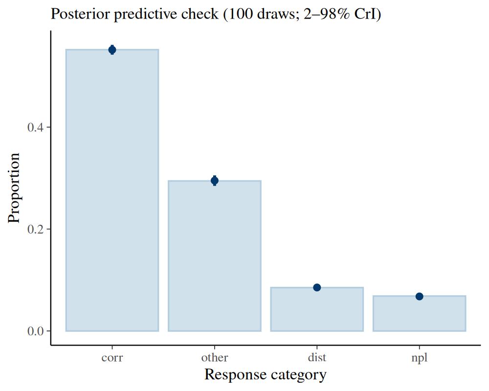 The plot shows observed response proportions as bars and the posterior predictive median with 95% credible interval as point-ranges for each response category. If the model fits the data well, the observed bars should align with the predicted point-ranges.