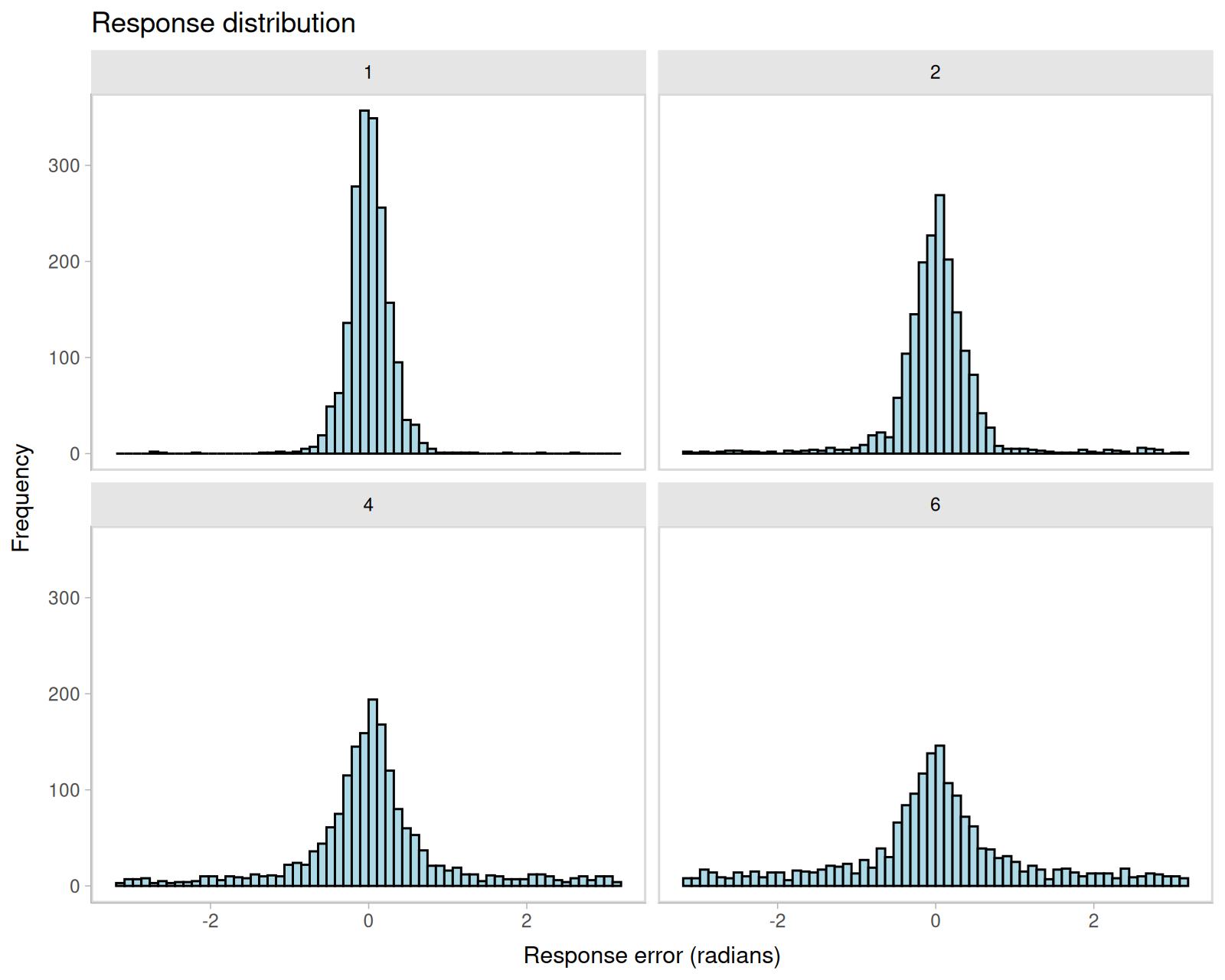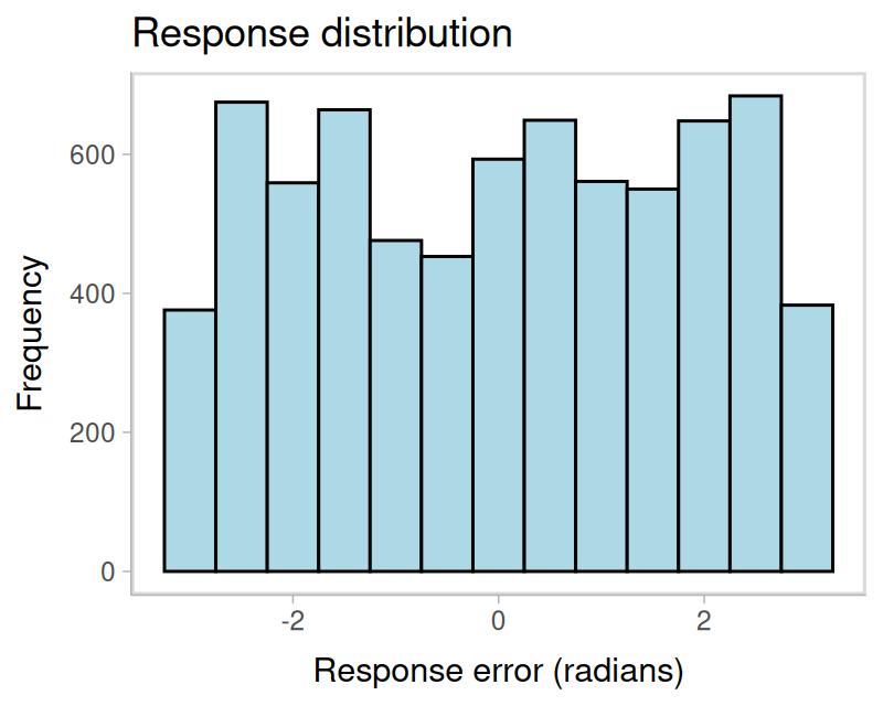 labs(title = "Response distribution", x = "Response error (radians)", y = "Frequency")