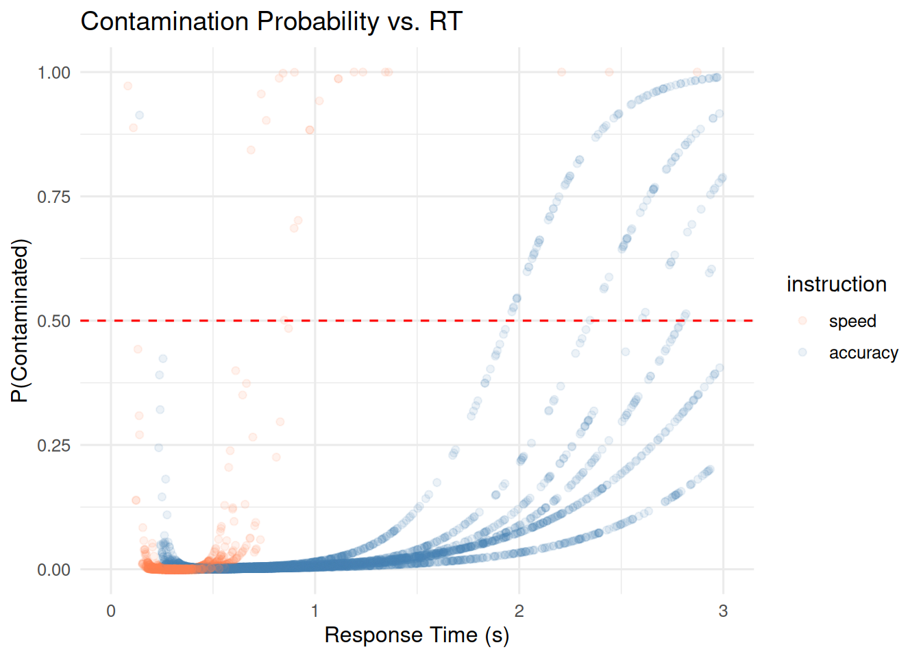 DDM and csWald work with individual trials, so contamination handling is optional. flag_contaminant_rts() implements the same mixture modelling approach as ezdm_summary_stats(method = "mixture") and returns a contamination probability for each trial; You can use these probabilities in various ways, such as filtering, probabilistic flagging, or weighting trials.