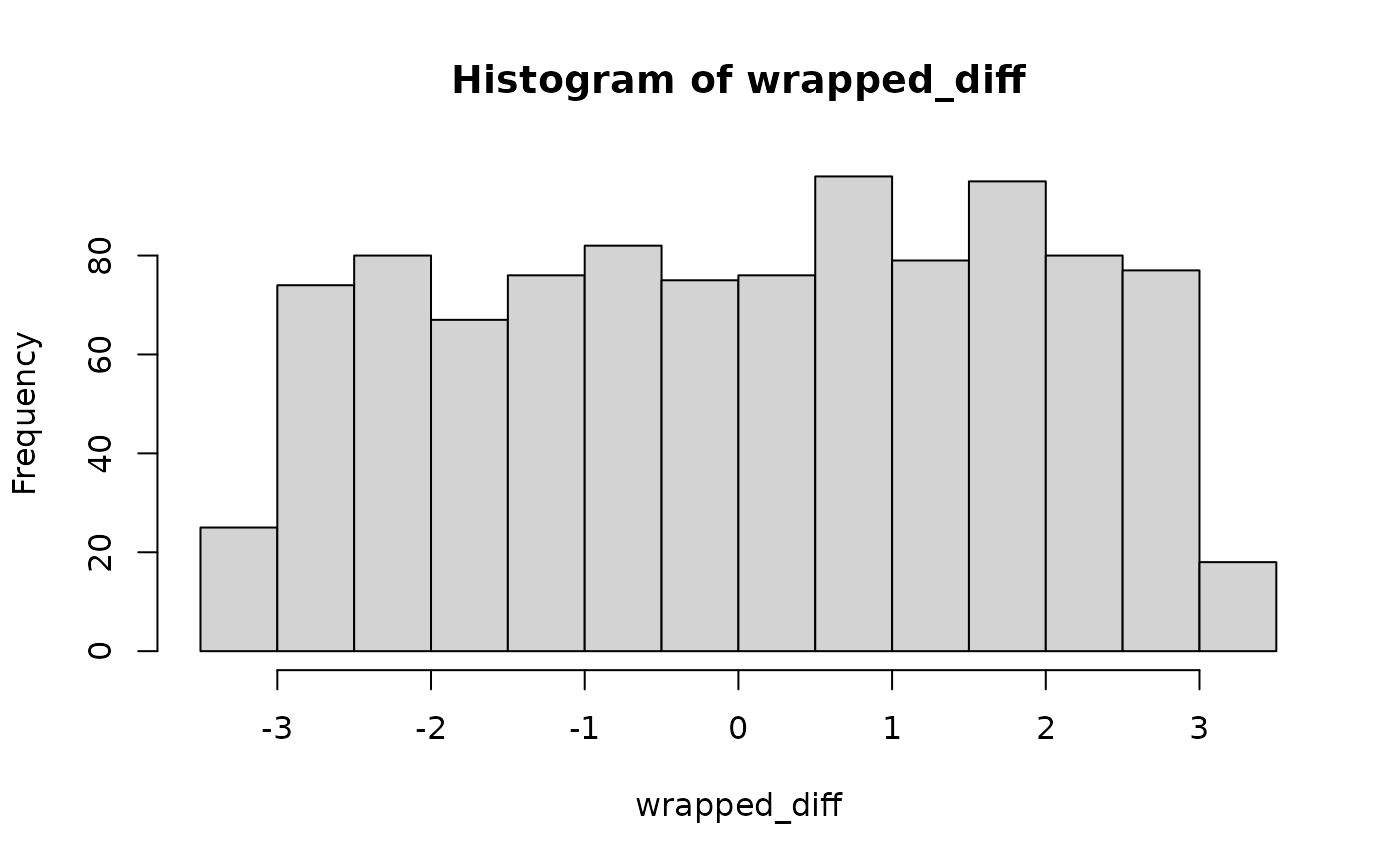 On the circular space, angles can be only in the range (-pi;pi or -180;180). When subtracting angles, this can result in values outside of this range. For example, when calculating the difference between a value of 10 degrees minus 340 degrees, this results in a difference of 330 degrees. However, the true difference between these two values is -30 degrees. This function wraps such values, so that they occur in the circle