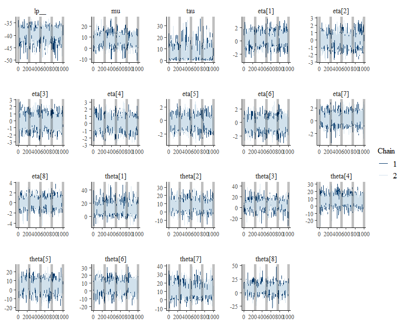 #> 13 theta[2] 7.87 7.87 6.20 5.66 -2.27 17.8 1.00 1549. 1515.